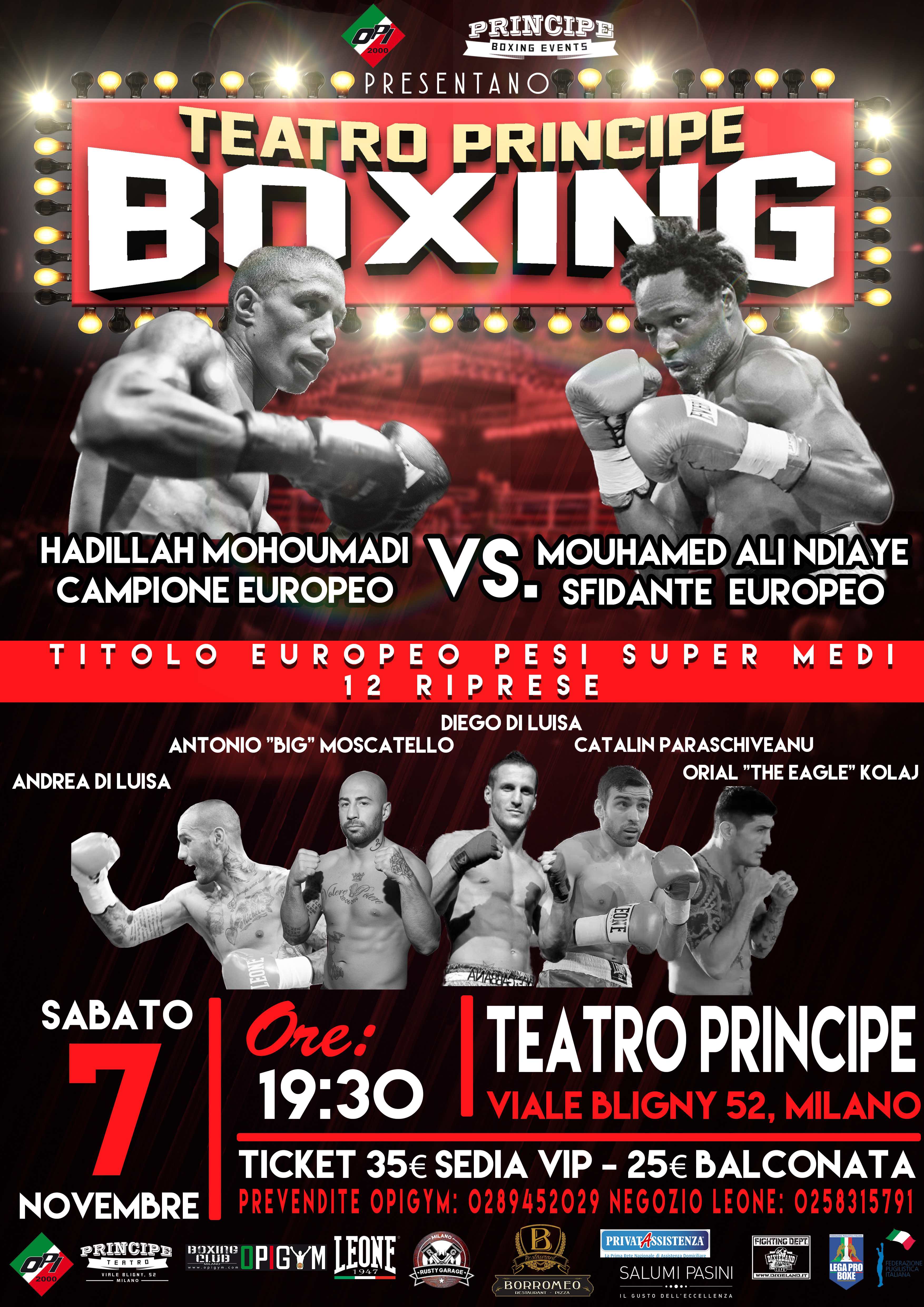 La nona manifestazione nell’arco di undici mesi organizzata dalla Principe Boxing Events di Alessandro Cherchi e Silvio Rognoni e dalla Opi 2000 di Salvatore Cherchi si preannuncia esplosiva per la qualità dei pugili che saliranno sul ring. Nel main event, il campione d’Europa dei pesi supermedi Hadillah Mohoumadi (nuovo acquisto della Opi 2000) difenderà il titolo contro l’italo-senegalese Mouhamed Ali Ndiaye sulla distanza delle dodici riprese. Il francese Mohoumadi si sta allenando alla Opi Gym di Milano con il maestro Franco Cherchi per questa difesa che si preannuncia molto difficile considerando la potenza di Ndiaye e la sua voglia di riscatto dopo la sconfitta ai punti contro Giovanni De Carolis nel maggio scorso a Roma. Ndiaye sa bene che questa potrebbe essere la sua ultima possibilità di diventare campione d’Europa dopo i due tentativi falliti contro l’altro francese Christopher Rebrasse (un pari nel 2013 e una sconfitta al quarto round nel 2014). Mohoumadi e Ndiaye hanno entrambi 35 anni, una equivalente esperienza pugilistica e quasi lo stesso numero di vittorie prima del limite. Mohoumadi ha sostenuto 23 incontri (19 vinti, 14 per knock out, 3 persi e 1 pareggiato) ed ha vinto il titolo di campione di Francia. Ndiaye è salito sul ring 28 volte con un bilancio di 24 vittorie, 13 prima del limite, 3 sconfitte e 1 pari ed è stato campione d’Italia e dell’Unione Europea. All’inizio della carriera ha anche vinto tre titoli IBF: giovanile, Mediterraneo e internazionale. Insomma, gli appassionati avranno pane per i loro denti.