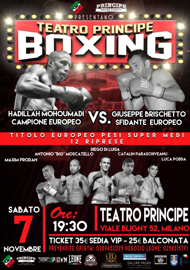 Cambiano alcuni protagonisti della manifestazione che sarà organizzata dalla Principe Boxing Events e dalla Opi 2000 sabato 7 novembre al teatro Principe di Milano. Il campione d’Europa dei pesi supermedi Hadillah Mohoumadi non difenderà il titolo contro l’italo-senegalese Mouhamed Ali Ndiaye, ma contro il siciliano Giuseppe Brischetto del Team Spagnoli. “Brischetto avrebbe dovuto affrontare Valerio Ranaldì per il vacante titolo italiano dei supermedi venerdì 6 novembre a Caltanissetta – spiega il presidente della Opi 2000 Salvatore Cherchi – ma quando gli abbiamo proposto di sostituire Ndiaye ha accettato con entusiasmo. Non si è voluto lasciar sfuggire l’opportunità di diventare campione d’Europa, come è giusto che faccia un professionista. Brischetto ha un buon record, è migliorato moltissimo, merita un’occasione importante come quella che gli stiamo dando. Sono certo che assisteremo ad un bel match.”