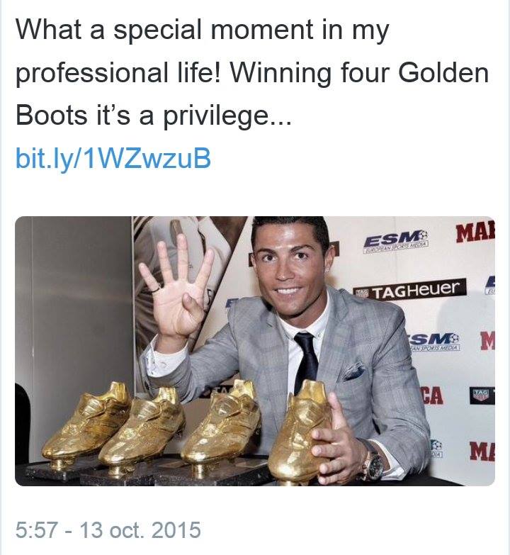 Immancabile l’immediata condivisione della gioia personale a mezzo social, con il tweet divenuto subito trend topic: tutto per affermare ancora una volta di essere il migliore, nell’eterna lotta contro Lionel Messi.