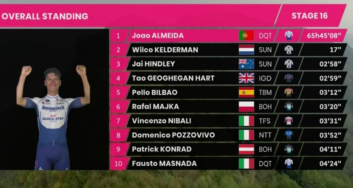 Nono successo in carriera per lo sloveno, che regala anche il nono sigillo in stagione alla sua squadra, scattando nell’ultimo chilometro e staccando il proprio avversario, impotente davanti all’acuto di Tratnik. Terza posizione per Enrico Battaglin, che vince la volata per il gradino più basso del podio battendo Kamil Malecki e Ben Swift. Nessun cambiamento nella classifica generale, con Joao Almeida che anche oggi rimane in Maglia Rosa guadagnando addirittura due secondi sui rivali grazie allo scatto avvenuto nell’ultimo chilometro. Ecco la nuova classifica generale: