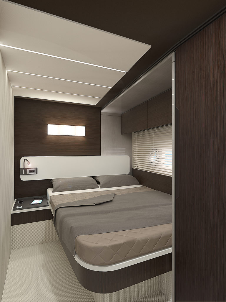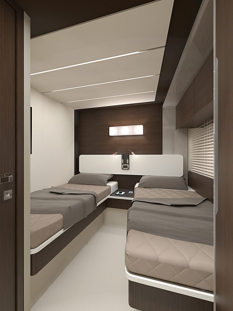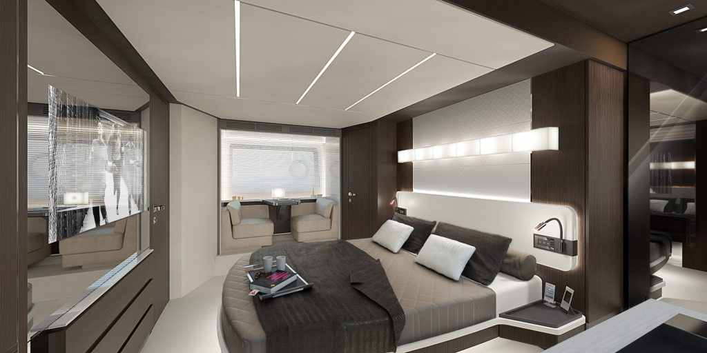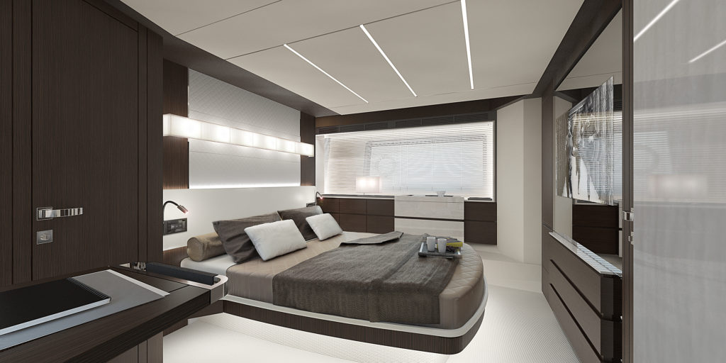 Lungo 22,60 metri e largo 5,60 metri il layout prevede 4 cabine tutte con bagno, di cui una armatoriale a tutta larghezza con bagno en suite e caratteristiche finestrature verticali full glass senza montanti, per un totale di 8 ospiti. Il flybridge è enorme, oltre 37 metri quadri progettati per la massima versatilità di utilizzo. Il main deck si sviluppa su un unico piano dal pozzetto alle scale di accesso al ponte inferiore, senza gradini o dislivelli, con ampia zona relax, cucina open space e timoneria a doppia seduta. Lo stile degli interni, è completamente rinnovato per dare una forte identità al modello, proposto in versione rovere decapato e essenza Ebano laccato lucido, oppure in essenza rovere naturale termotrattato e prezioso Sicomoro laccato lucido Un accurato light design ha consentito di utilizzare luci integrate completamente con celini e arredi. Le prestazioni del 72, con due motori MAN V12 da 1400 Hp ciascuno, sono in perfetta sintonia con il carattere sportivo del modello. La velocità di crociera si attesta sui 26 nodi, mentre la massima velocità, secondo i dati di progetto del cantiere, è di 31 nodi.
