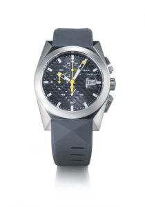 Nel cronografo il vetro minerale è dotato di una finestra lenticolare che facilita la lettura del datario. I contatori sono così posizionati: a ore sei i secondi continui dell’orologio, a ore 9 il conta ore del cronografo mentre a ore dodici, il contaminuti. Quest’ultimo presenta una peculiarità di design: la fase di riposo, anziché essere a ore dodici è posizionata a ore tre ed è contrassegnata dalla parola “zero”.