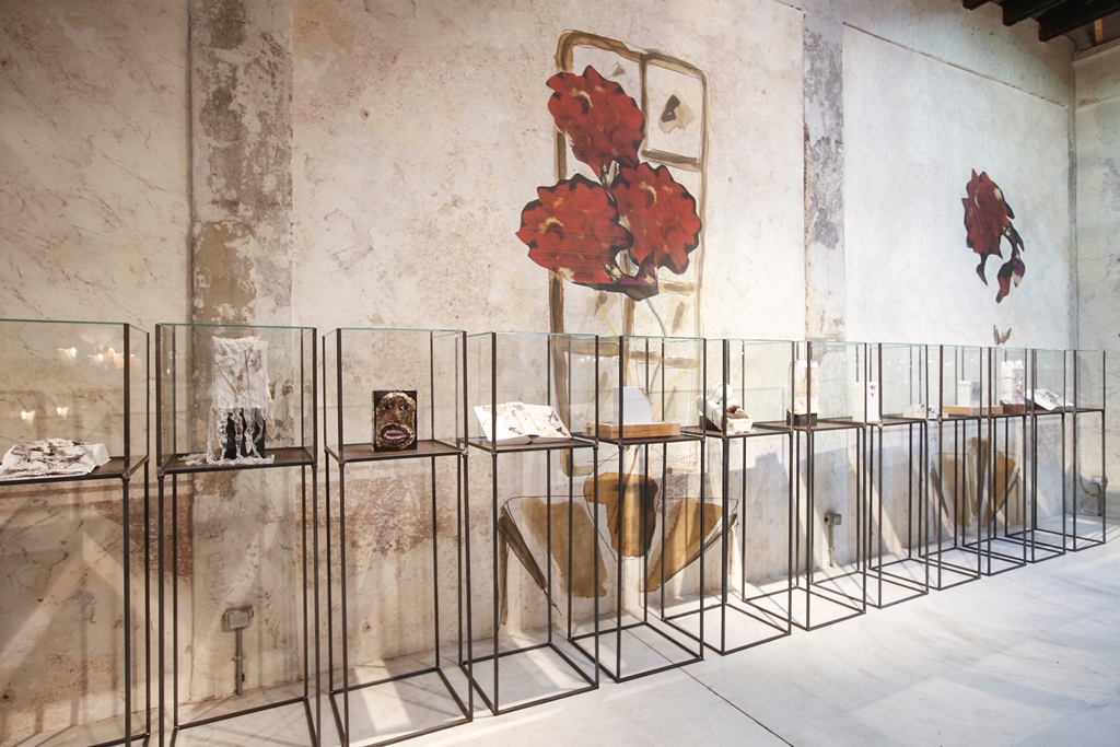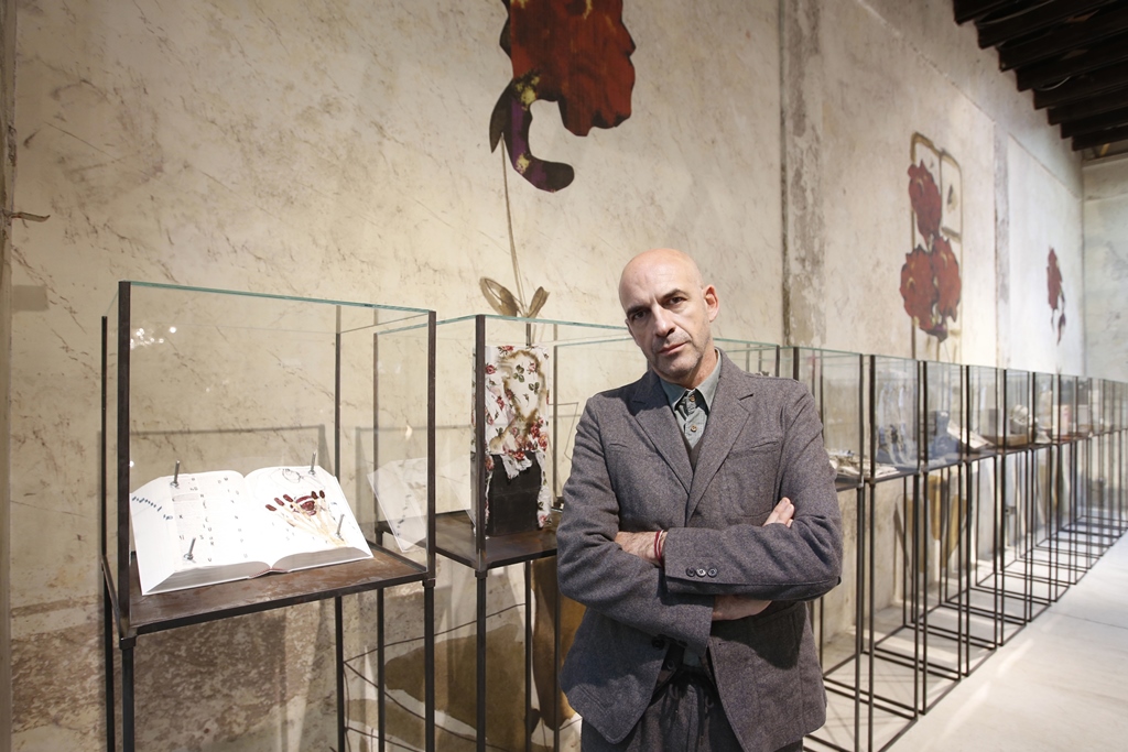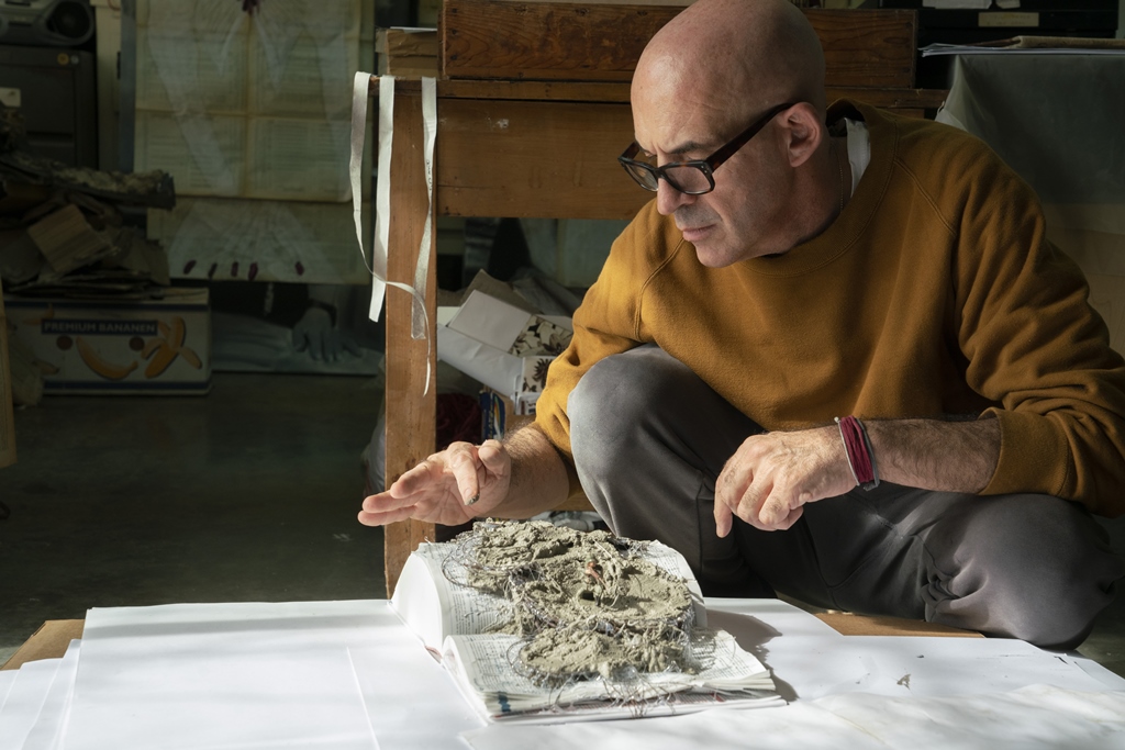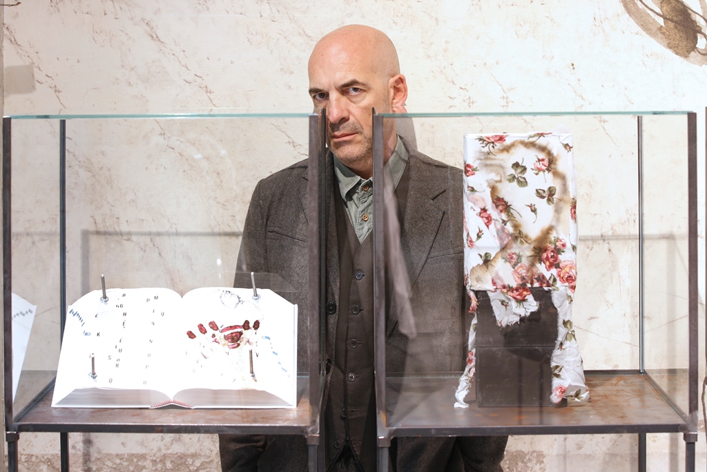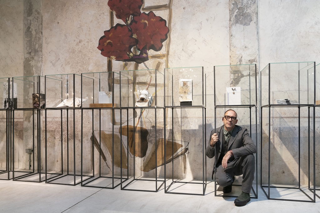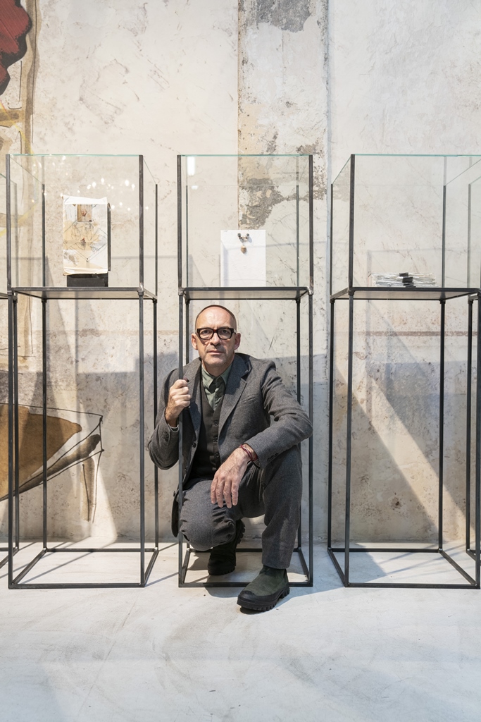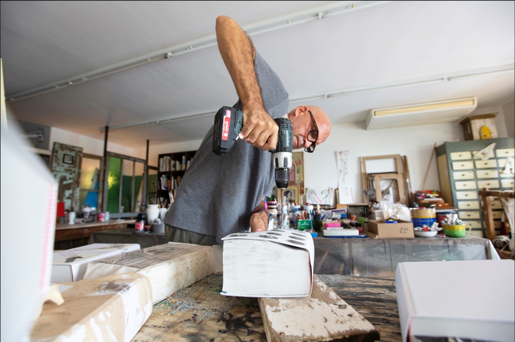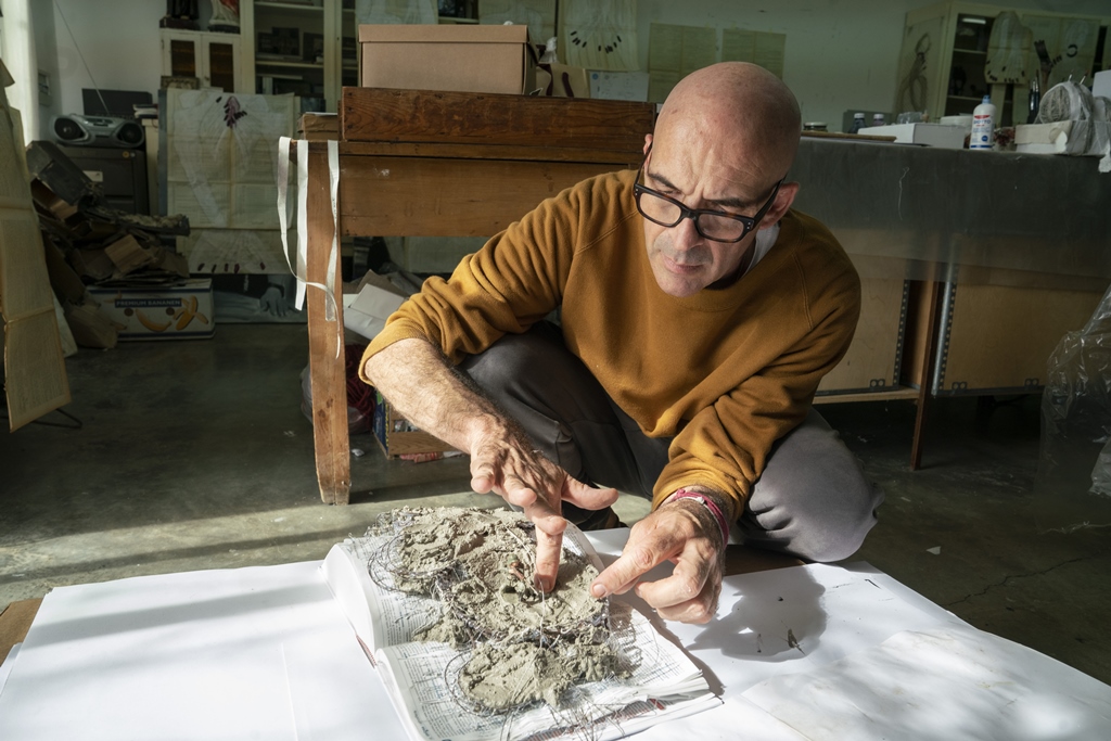 Antonio Marras, motiva con entusiasmo questo progetto e aggiunge: “l‘urgenza di tradurre in segno quel che c’è intorno e dentro di me, nel tempo, si è fatta sempre più pressante. Come se avessi qualcosa che vuol venir fuori e non riesco ad arginare. Cerco di vedere ciò che nelle cose non si vede, ciò che è nascosto. Tendo a captare e fissare tratti, pennellate, immagini su qualsiasi materiale abbia sotto mano. Mi affascina sporcare, imbrattare, rendere impuro, porre a contatto superfici, oggetti diversi. Trascorrere lunghe ore, dimentico di tutto e di tutti. Un foglio bianco, piccoli spazi di pagine già scritte, quaderni usati, vecchie copertine di libri, carta o cartone, cartoline, brandelli di stoffa, tutto chiede di essere riempito. Da incosciente quale sono un vocabolario diventa l’oggetto ideale per raccontare, fuori dalle righe, fuori dai margini. Linee, disegni, pasticci, garze, fil di ferro, cemento, occhi di bambola, soldatini, bruciature, spine, suture, bulloni, trasferibili, sono le mie parole inespresse, il codice attraverso cui si materializza il mio mondo. Accumuli, stratificazioni, assemblaggi si oppongono a levare, sottrarre, ridurre. Lottano contro la platitude, la piattezza, la banalità, il luogo comune. Vince l’eccesso, l’eccentricità”.