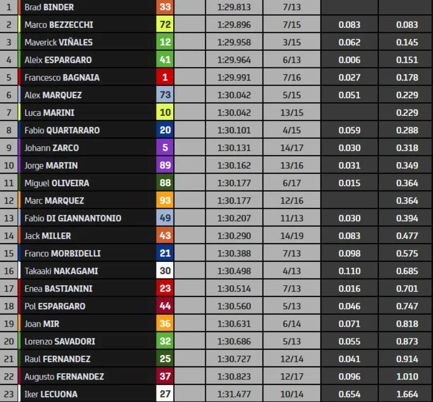 Nelle ultime prove libere il giro più veloce è stato realizzato da Binder, subito dietro Bezzecchi, Vinales, Espargaro. Al quinto posto il campione del mondo in carica Bagnaia. All’ottavo posto Quartararo, solo decimo Jorge Martin.