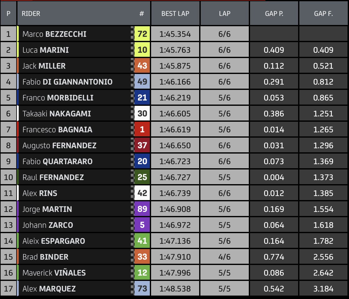 Bezzecchi è il più veloce del warm up, seguito dal suo compagno di squadra Luca Marini, terzo invece un ottimo Jack Miller. Questo posto per Di Giannantonio, seguito da Morbidelli e Nakagami, settimo invece Bagnaia. Nono temop per Quartararo. Più attardate le Aprilia, con Espargaro 14° e Vinales 16°.
