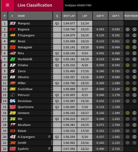 Il più veloce oggi nelle Fp3 è stato Marc Marquez, seguito da un ottimo Bagnaia e da Pol Espargaro. Quarto tempo per Rossi, seguito da Nakagami e Rins. Ottavo invece Vinales, mentre le Ducati ufficiali di Petrucci e Dovizioso si sono piazzate rispettivamente al 13° e 14° posto.