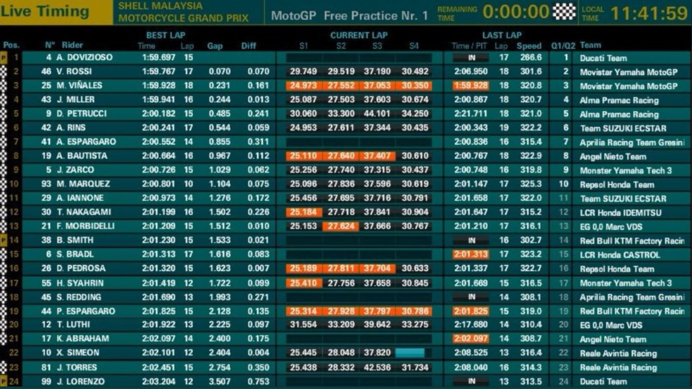 Un riferimento fatto segnare proprio nel finale della FP1, ovvero nel time-attack effettuato per evitare sorprese in caso di pioggia nel corso del fine settimana di Sepang. Al secondo posto ecco Valentino Rossi, staccato di soli 70 millesimi da Andrea Dovizioso. Ottima la prestazione del Dottore, seguito dal compagno di squadra Viñales e dalle due Pramac di Miller e Petrucci. Sesta la Suzuki di Rins, mentre alle sue spalle troviamo l’Aprilia di Aleix Espargaro e l’Avintia di Bautista. Nono Zarco, mentre chiude al decimo posto Marc Marquez, in difficoltà sul circuito malese. Ultimo infine Jorge Lorenzo, che completa 13 giri rimanendo però a 3″5 dal compagno di squadra Dovizioso.