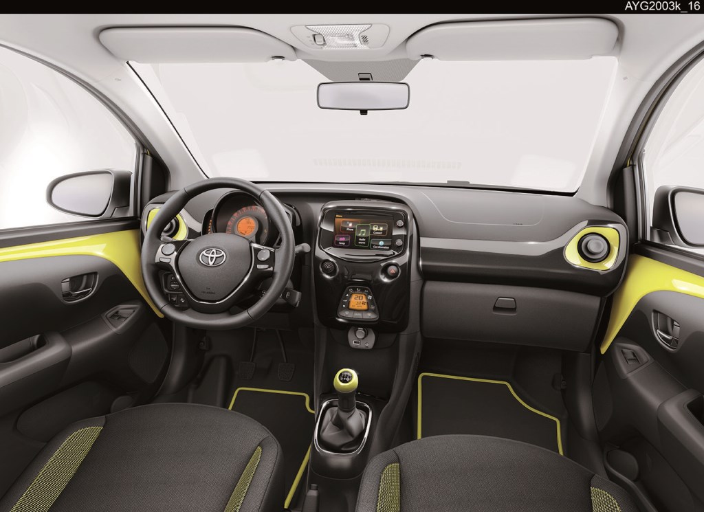 La finitura del coprimozzo centrale è invece in tinta con la carrozzeria. Stilisticamente gli interni riflettono le finiture degli esterni: le bocchette di ventilazione ed il pomello del cambio sono in colore Yellow mentre il pannello strumenti, gli inserti della console centrale e della leva del cambio sono nero lucido. Tra gli opzionali disponibili è possibile scegliere il Toyota Safety Sense, che grazie a dispositivi quali il Sistema Pre-Collisione (PCS)e l’Avviso Superamento Corsia (LDA), è in grado di assicurare una guida ancora più sicura.