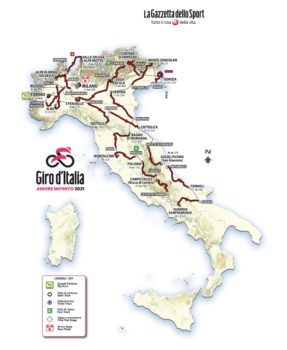 La Cima Coppi sarà il Pordoi (2.239 m) inserito nel tappone dolomitico che prevede anche il Passo Fedaia (Montagna Pantani di questo Giro) e il Passo Giau e l’arrivo a Cortina d’Ampezzo sede delle Olimpiadi Invernali del 2026. Gran finale a Milano con una cronometro di 29,4 km che partirà da Senago. Due gli sconfinamenti della Corsa Rosa: in Slovenia nella Grado-Gorizia e in Svizzera nella Verbania-Valle Spluga/Alpe Motta. Il dislivello totale del Giro d’Italia 2021 sarà di 47.000 m.