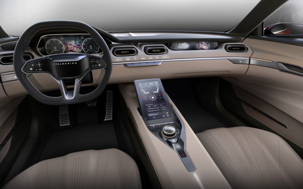 Come da tradizione, il centro stile Italdesign, guidato da Filippo Perini, ha impostato lo studio per questa concept in modo che, con pochi accorgimenti, sia facilmente adattabile ad una produzione di serie ed in linea con il family feeling di diversi marchi. Le poche concessioni “esotiche”, tipiche di una showcar, sono concentrate nelle ampie portiere che si sollevano ad ali di gabbiano, consentendo l’accesso in vettura contemporaneamente ai passeggeri della fila anteriore e posteriore, ai gruppi ottici posteriori e alle pinne aerodinamiche laterali, solidali alle portiere.