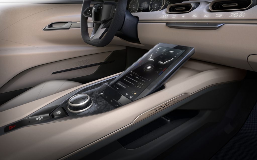 L’impostazione dell’abitacolo è in linea con il posizionamento premium della DaVinci, coniuga tecnologia e materiali pregiati, evidenziando lo spazio a bordo come vero valore aggiunto. La plancia è asimmetrica, leggermente orientata a favore del guidatore; tre schermi, uno in sostituzione del quadro comandi dietro al volante, uno di fronte al passeggero ed un terzo, più grande, sopra il tunnel centrale, accolgono tutte le funzioni principali: dall’infotainment ai dati di viaggio, dalla regolazione del clima a quelle per il comfort di guidatore e passeggeri. La climatizzazione a bordo è regolata da bocchette esagonali incastonate all’interno della plancia; grazie alla collaborazione con Alcantara, marchio registrato di Alcantara S.p.A. il reparto Color&Trim è riuscito a lavorare il rivestimento della parte centrale della plancia trasformandola in una superficie informativa: da Alcantara stessa emergono, retroilluminate, le icone relative ai tasti sottostanti e l’indicazione della temperatura dell’abitacolo.