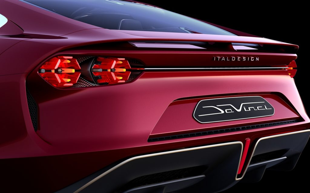 L’elemento esagonale, introdotto per la prima volta sulla GTZero del 2016 e presente in tutte le vetture Italdesign seguenti, torna nella DaVinci sia proprio nell’apertura del cofano anteriore, sia nei gruppi ottici posteriori dove l’ispirazione al bio-design è più evidente. I fari posteriori, basati su tecnologia OLED, sono infatti composti da sei “petali” che ne formano il contorno esagonale, al cui interno sono racchiusi “pistilli” per gli indicatori di direzione e luce della retromarcia. Il posteriore richiama esplicitamente la tradizione italiana delle vetture Gran Turismo ed è caratterizzata dalla classica coda tronca, che combina elemento estetico e funzione aerodinamica. Lo spoiler attivo, posizionato al di sopra dei gruppi ottici, ha un #design avvolgente e si prolunga sui lati.
