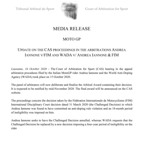 Non arriverà in questi giorni la sentenza del Tas di Losanna su Andrea Iannone, risultato positivo lo scorso novembre al drostanolone in un controllo antidoping effettuato in Malesia.