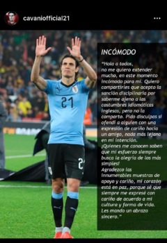 Edinson Cavani ha accettato la squalifica, ma ha espresso il proprio punto di vista con un post sui social: “ciao a tutti. Non voglio dilungarmi molto in questo momento difficile per me. Voglio condividere con voi che accetto la sanzione disciplinare, ammettendo di essere estraneo alle tradizioni linguistiche inglesi, ma non la condivido. Chiedo scusa se ho offeso qualcuno con un’espressione di affetto verso un amico, perché questa era la mia intenzione. Chi mi conosce sa che mi impegno sempre per dare gioia e felicità a tutti! Apprezzo gli innumerevoli messaggi di sostegno e affetto. Sono in pace con me stesso, perché so di essermi sempre espresso con affetto nei confronti di un amico. Vi mando un abbraccio sincero“.