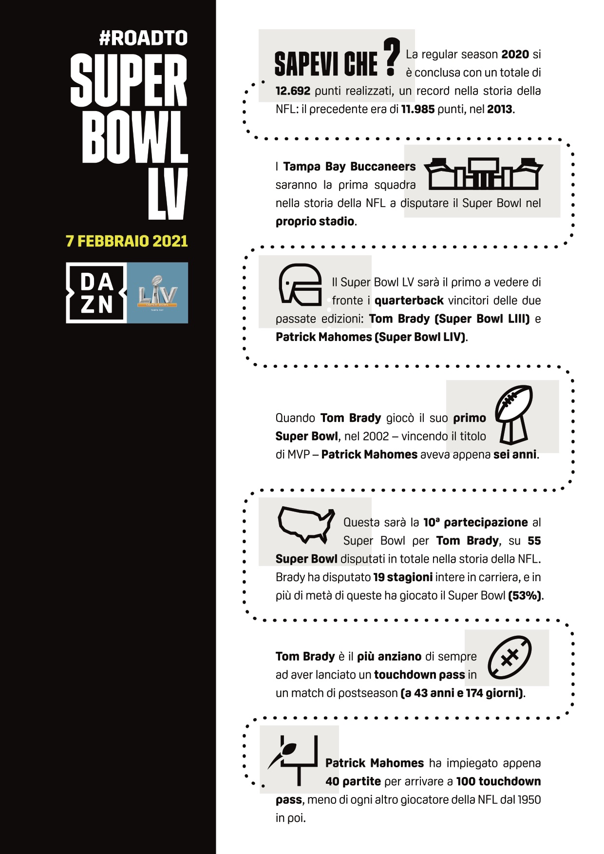 Tempo di Super Bowl e DAZN (Attiva ora il tuo abbonamento) si prepara a scendere in campo per uno degli eventi sportivi più seguiti al mondo. Domenica 7 febbraio a partire dalle 23:55, la piattaforma di streaming trasmetterà in diretta il Super Bowl LV che quest’anno andrà in scena nel suggestivo Raymond James Stadium di Tampa, in Florida. I Tampa Bay Buccaneers di Tom Brady affronteranno in casa i Kansas City Chiefs di Patrick Mahomes per una sfida a colpi di touch down che promette spettacolo.