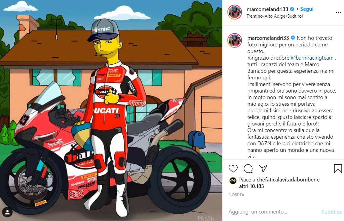Una scelta ponderata e assunta con responsabilità, come annunciato dallo stesso Melandri nel suo messaggio social: “non ho trovato foto migliore per un periodo come questo. Ringrazio di cuore il Team Barni, tutti i ragazzi della squadra e Marco Barnabò per questa esperienza ma mi fermo qui. I fallimenti servono per vivere senza rimpianti ed ora sono davvero in pace. In moto non mi sono mai sentito a mio agio, lo stress mi portava problemi fisici, non riuscivo ad essere felice, quindi giusto lasciare spazio ai giovani perché il futuro è loro!!“.