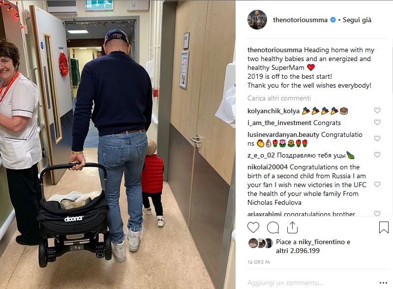 In attesa di conoscere l’esito dell’eventuale squalifica dopo i fatti accaduti nel post match contro Nurmagomedov, nonchè di sapere se riuscirà ad avere la sua rivincita con il fighter daghestano, Conor McGregor si dedicherà per un po’ di tempo alla sua famiglia che nelle ultime ore si è allargata! La fidanzata Dee Devlin ha dato alla luce il secondo figlio del fighter irlandese che sui social ha espresso tutta la sua felicitià: “torno a casa con i miei due bambini sani e forti e al fianco di una Super Mamma! ?Il 2019 è iniziato nel migliore dei modi! Grazie a tutti per gli auguri“.