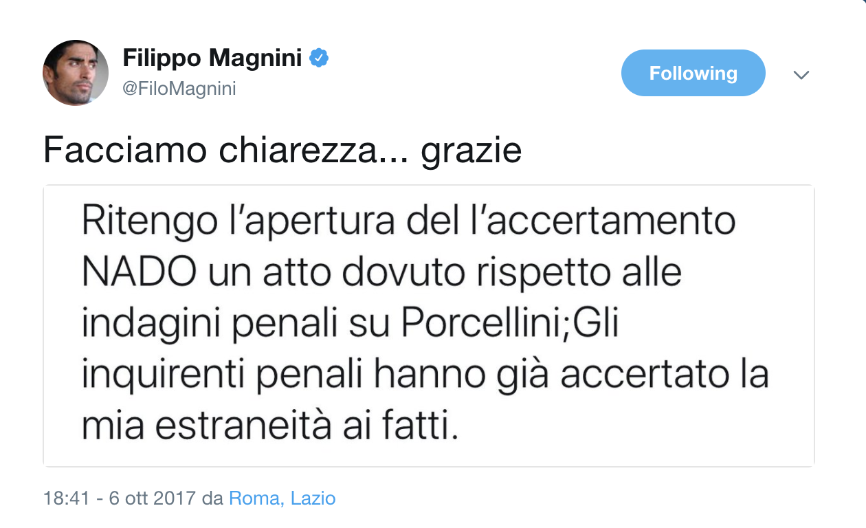 Magnini indagato per doping, Filippo dice subito la sua – Il nuotatore però ci tiene a chiarire le cose fin da subito e comunica coi fan e con i media attrverso la sua pagina Twitter ufficiale. “Ritengo l’apertura dell’accertamento NADO un atto dovuto rispetto alle indagini penali su Porcellini; – twitta Filippo – gli inquirenti penali hanno già accertato la Mia estraneità ai fatti”. “Facciamo chiarezza… Grazie”, conclude Magnini infine.