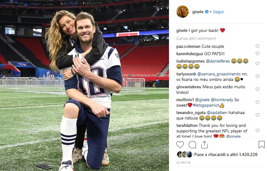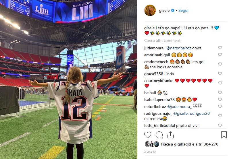 Questa notte gli Stati Uniti si fermano per la partita di football più attesa dell’anno: la finalissima del Super Bowl! Di fronte Los Angeles Rams e New England Patriots, di scena al Mercedes-Benz Stadium di Atlanta (Georgia), una sfida elettrizzante da giocare in un gioiello d’architettura a stelle e strisce. In campo il più atteso, come sempre del resto se giocano i Patriots, è il quarterback più forte della storia, Tom Brady. A 41 anni, TB12 sogna il sesto anello con la sua franchigia e, prima della gara, ha incassato due auguri importantissimi: quelli della moglie Gisele Bundchen e della figlia Vivian. La super modella ha rivolto un dolce messaggio su Instagram al marito nel quale, in uno scatto che la ritrae mentre lo abbraccia da dietro, ha scritto: “ti copro le spalle”. In un’altra foto invece, appare la piccola Vivian con la maglia di Brady e la scritta: “forza papà”! Se Brady avesse avuto di qualche motivazione in più per scrivere un’altra pagina della sua eterna leggenda, ne ha trovate addirittura due, nelle donne più importanti della sua vita.
