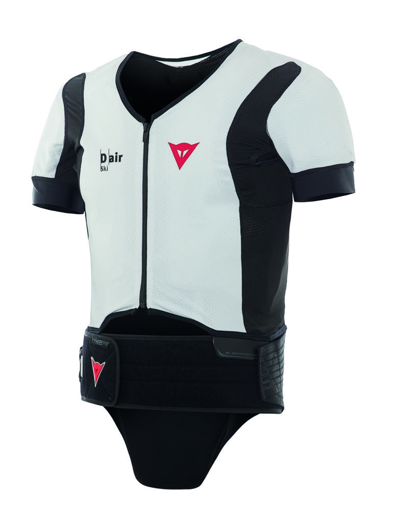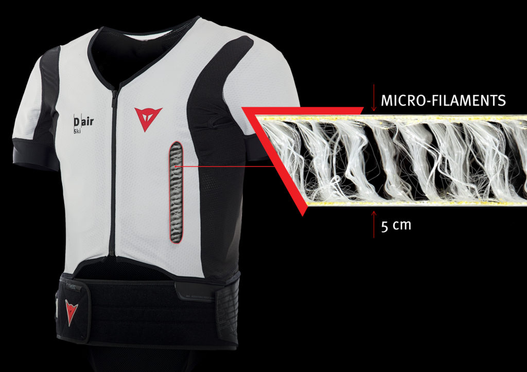settore motociclistico, settore in cui dainese è sempre stata pioniera. Il cuore del D-air® Ski è il sacco air-bag e la sua particolare e innovativa costruzione. Le superfici del sacco sono collegate da una moltitudine di microfilamenti che consentono all’air-bag di espandersi con spessore e pressioni costanti lungo tutta la sua superficie e in questo modo abbracciare il corpo dell’atleta. L’intelligenza del D-air® Ski è invece rappresentata dall’algoritmo di attivazione. L’algoritmo è in grado di individuare il sopraggiungere di cadute con dinamiche rotazionali o di rolling, espandendo in 25 millisecondi il sacco che copre spalle, clavicole e cassa toracica. Dainese ribadisce il suo committment totale alla sicurezza degli sportivi di tutto il mondo offrendo il sistema D-air® Ski non solo agli atleti dei pool di cui è sponsor ufficiale, ma a tutte le Federazioni. Dainese è entrata per la prima volta nel mondo dello sci alpino nel 1995, proteggendo la spina dorsale dei discesisti con il paraschiena e introducendo, per la prima volta nel circo bianco, le protezioni per l’atleta. Oggi, grazie ad un’innovazione continua e all’impiego di tecnologie sempre più sofisticate, Dainese ridefinisce gli standard protettivi degli sciatori e il D-air® Ski ne rappresenta la massima espressione. Un’altra pietra miliare nella storia della sicurezza dello sci alpino.